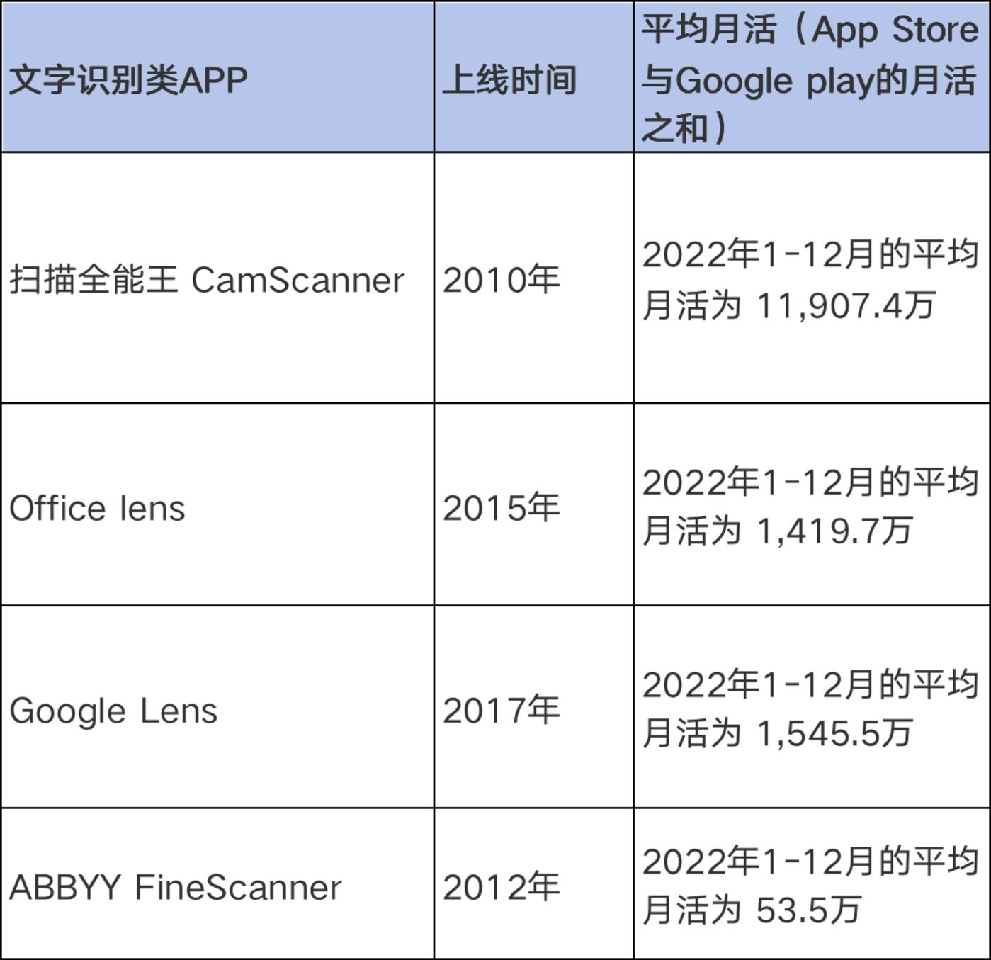 據了解,2010 年上線(xiàn)的掃描全能王是最早將掃描技術(shù)應用于手機等移動(dòng)端的 APP 之一。截至 2022 年末,掃描全能王曾在 App Store 上 105 個(gè)國家和地區的效率類(lèi)免費應用下載量排行榜位列第一,月活用戶(hù)也在全球市場(chǎng)上大幅領(lǐng)先于 Microsoft Office lens、Google lens 等同類(lèi) APP。眼下,擁有超 3 億用戶(hù)的“掃描全能王”對于行業(yè)而言,或許已經(jīng)不再僅僅是一個(gè)產(chǎn)品名,而是一定程度上成為掃描類(lèi)目的代名詞。