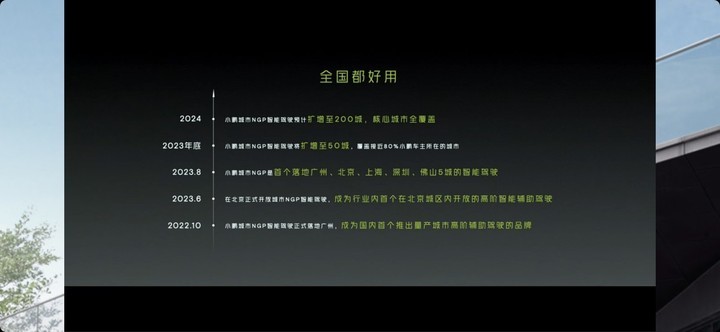 更高頻的使用,帶動(dòng)了小鵬開(kāi)城進(jìn)度。何小鵬宣布,到 2023 年底小鵬城市 NGP 智能駕駛將擴增至 50 城,覆蓋接近 80% 小鵬車(chē)主所在的城市;2024 年,城市 NGP 預計會(huì )擴增至 200 城,做到核心城市全覆蓋。