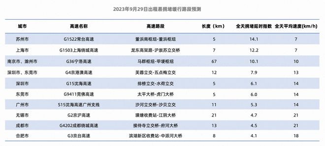 與此同時(shí),高德地圖發(fā)布了《2023 中秋·國慶假期出行預測報告》報告,預測了即將到來(lái)的黃金周交通出行狀況。該報告數據顯示,預計 9 月 29 日全國高速出程易擁堵緩行路段有 G1522 常臺高速蘇州段(董浜南樞紐-董浜樞紐),平均車(chē)速約 7km/h;其他還有 G1503 上海繞城高速(龍東高架路-滬崇蘇立交橋),以及 G36 寧洛高速南京、滁州段(馬群樞紐-甲埂樞紐)等。