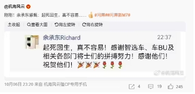 在 @機海風(fēng)云曬出的截圖中,余承東在回復中感嘆道“起死回生,真不容易”,并向智選車(chē)、車(chē) BU 和相關(guān)部門(mén)的工作者致以謝意。
