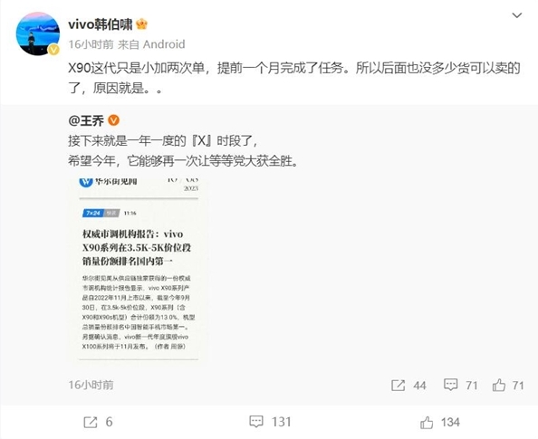 vivo韓伯嘯表示,vivo X90系列這代加了兩次單,但還是提前一個(gè)月完成了銷(xiāo)售任務(wù),后面沒(méi)有多少貨可以賣(mài)了?! ?/p>