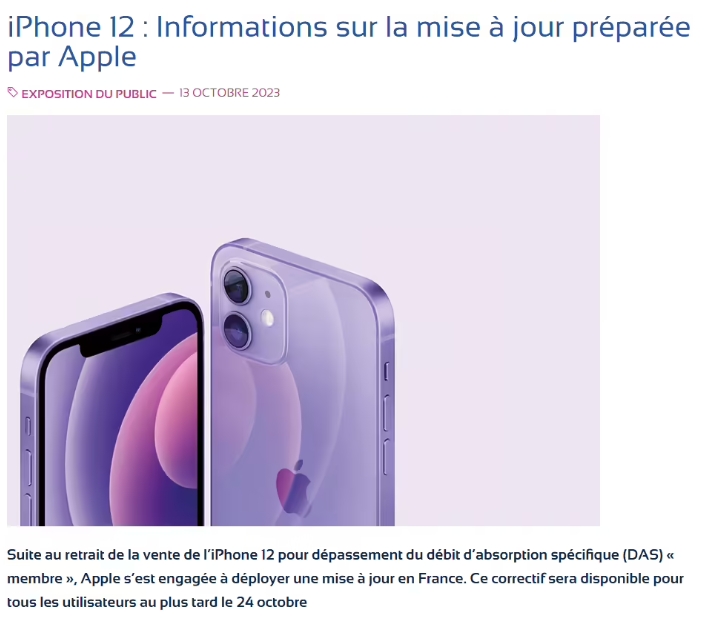 蘋(píng)果公司發(fā)布新聞稿,即將針對法國地區的 iPhone 12 用戶(hù),發(fā)布 iOS 17.1 系統更新,降低設備已離身并放在靜態(tài)表面上時(shí)的能量傳輸功率,從而符合法國國家頻率管理局(ANFR)的相關(guān)測試要求。