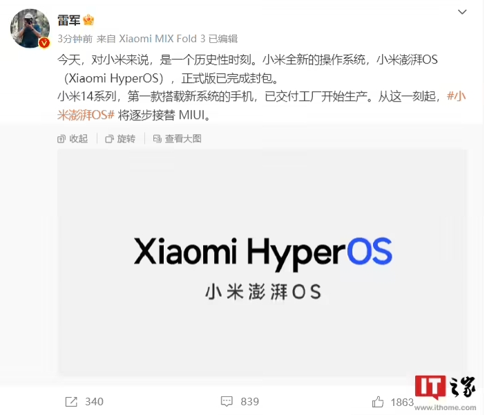 剛剛小米創(chuàng )始人雷軍在微博稱(chēng),今天對小米來(lái)說(shuō),是歷史性時(shí)刻。小米全新操作系統,小米澎湃 OS(Xiaomi HyperOS),正式版完成封包。