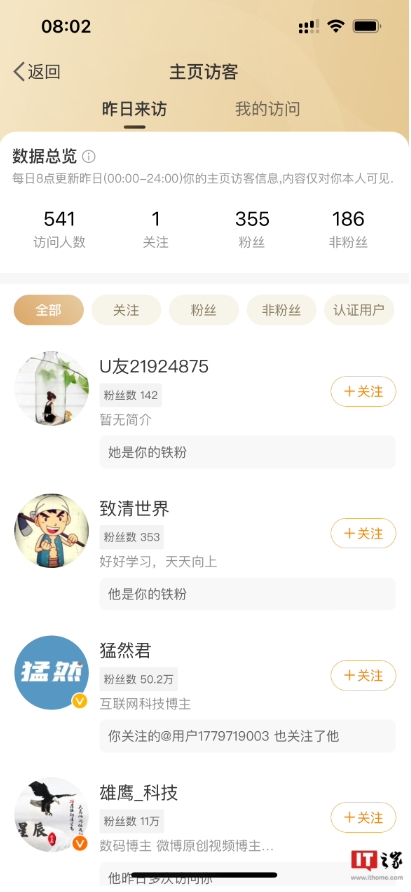 頁(yè)面顯示,微博會(huì )每日 8 點(diǎn)更新昨日主頁(yè)訪(fǎng)客信息,內容僅對本人可見(jiàn)。不論訪(fǎng)客是否關(guān)注博主,博主都能看到這些訪(fǎng)客,而且還能按照全部、關(guān)注、粉絲、非粉絲和認證用戶(hù)分類(lèi)查看。