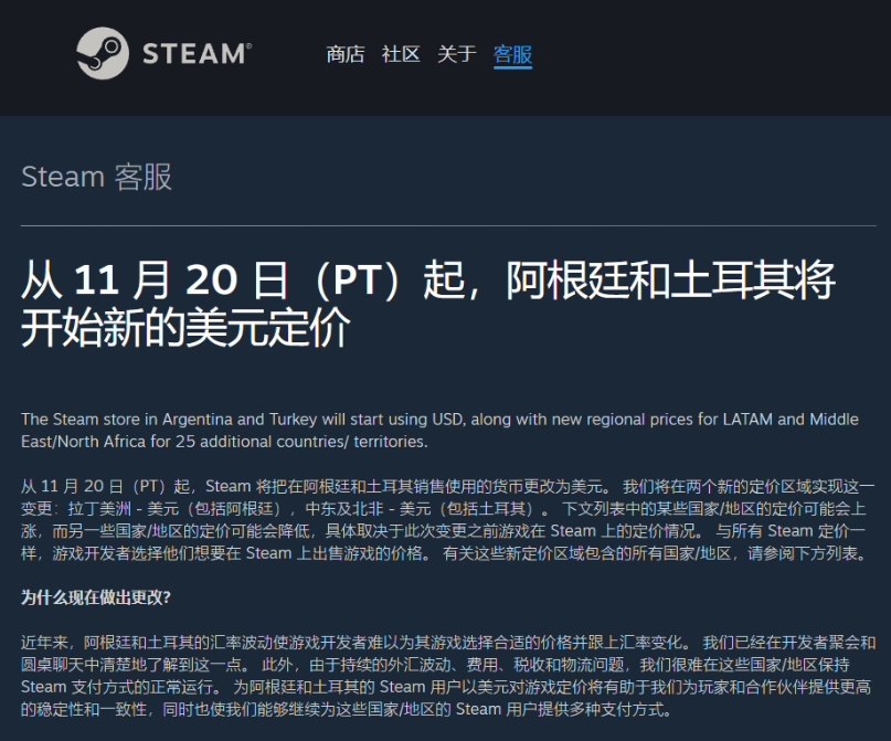 Steam 官網(wǎng)日前發(fā)布公告,自 11 月 20 日起,Steam 將把在阿根廷和土耳其銷(xiāo)售使用的貨幣改為美元。
