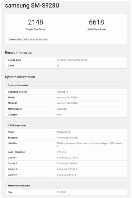 Geekbench跑分網(wǎng)站顯示,三星Galaxy S24 Ultra搭載的驍龍8 Gen3 CPU主頻最高達到了3.4GHz,比標準版驍龍8 Gen3 3.3GHz主頻更高。