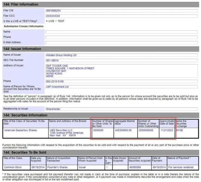 據美國證交會(huì )(SEC)官網(wǎng)披露的 144 文件顯示,馬云家族信托 JC Properties Limited (一家英屬維爾京群島公司) 和 JSP Investment Limited (一家英屬維爾京群島公司) 擬于 11 月 21 日分別減持 5,000,000 股阿里巴巴創(chuàng )始人股份,共涉及股票市值 8.707 億美元(備注:當前約 63.13 億元人民幣)。