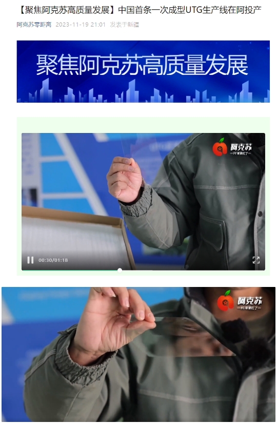 據阿克蘇地區融媒體中心“阿克蘇零距離”公眾號報道,中國首條一次成型超薄柔性電子玻璃(UTG)生產(chǎn)線(xiàn)在東旭集團新疆阿克蘇光電產(chǎn)業(yè)園投產(chǎn)。