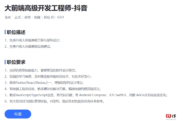 其中,字節跳動(dòng)上線(xiàn)了“大前端高級開(kāi)發(fā)工程師”一職,主要負責抖音大前端基礎工程與架構設計、大前端基礎設施建設。該崗位需要有前端工程化經(jīng)驗,熟悉 JavaScript / TypeScript 語(yǔ)言,有代碼潔癖;有 Android Compose、iOS SwiftUI、鴻蒙 ArkTs 開(kāi)發(fā)經(jīng)驗者優(yōu)先。