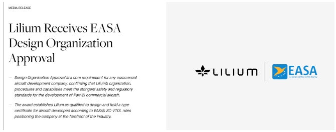 德國“電動(dòng)垂直起降飛行器”(eVTOL)開(kāi)發(fā)商Lilium N.V.在官網(wǎng)宣布,公司收到了歐盟航空安全局(EASA)頒發(fā)的“設計機構批準”(Design Organization Approval,DOA)。