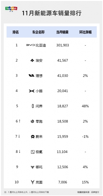 新能源車(chē)11月銷(xiāo)量成績(jì)出爐:理想提前達成年度目標,小鵬再創(chuàng )單月新高