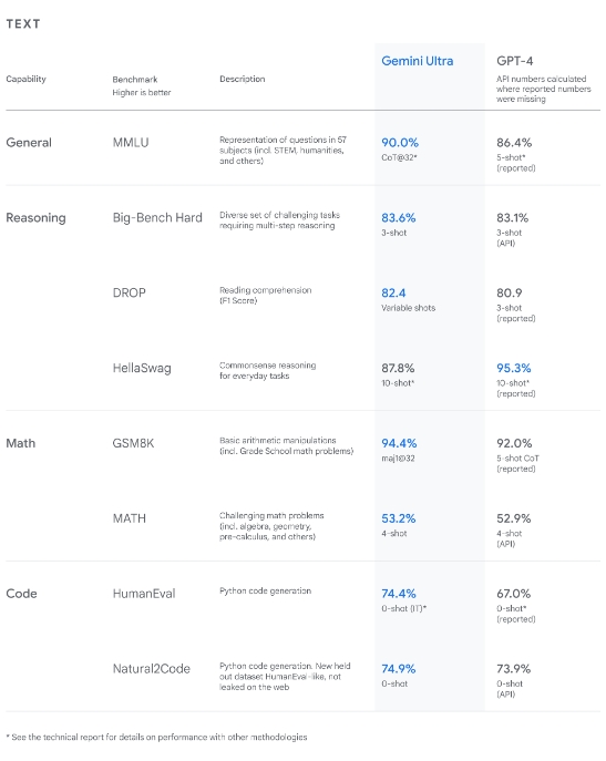 根據谷歌給出的基準測試結果,Gemini 在許多測試中都表現出了“最先進(jìn)的性能”,甚至在大部分基準測試中完全擊敗了 OpenAI 的 GPT-4。