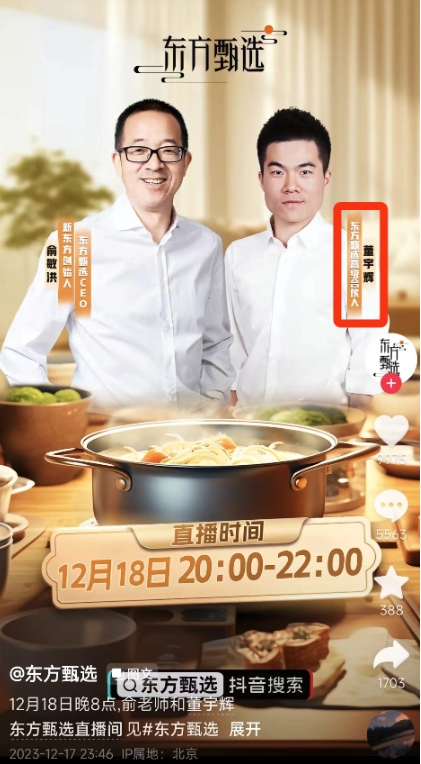 12月18日凌晨消息,東方甄選剛剛發(fā)布了直播預告,董宇輝的身份變?yōu)?ldquo;東方甄選高級合伙人”。此前,俞敏洪在直播中稱(chēng),未來(lái)董宇輝一定會(huì )有話(huà)語(yǔ)權。
