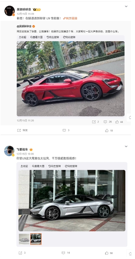 從上周末開(kāi)始,多名博主在微博曬圖片稱(chēng)自己“偶遇”了比亞迪旗下豪華純電超跑車(chē)型 —— 仰望 U9。綜合 @吳穎碎碎念 、@飛要說(shuō)車(chē) 等博主放出的“諜照”,可見(jiàn)新車(chē)已經(jīng)完全脫去了內測車(chē)型專(zhuān)屬的偽裝貼紙,以完整面貌亮相于世。