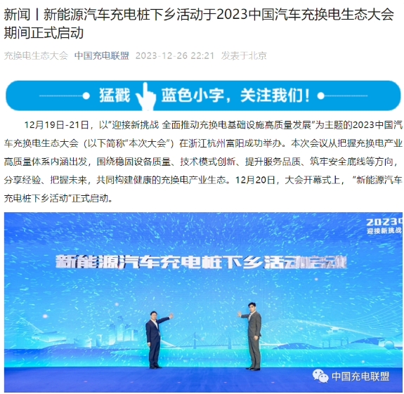 在近日舉辦的 2023 中國汽車(chē)充換電生態(tài)大會(huì )上,“新能源汽車(chē)充電樁下鄉活動(dòng)”正式啟動(dòng)。