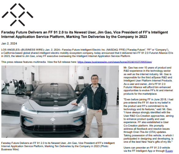 法拉第未來(lái)向 Jim Gao 交付 FF 91 2.0,2023 全年交付十輛車(chē)