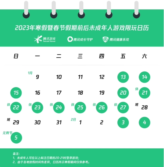 騰訊游戲公布寒假限玩日歷:未成年人假期最多可玩 16 小時(shí)