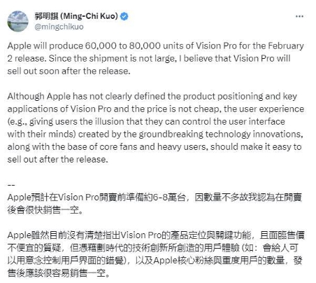 郭明錤在社交媒體上說(shuō):“蘋(píng)果預計在 Vision Pro 開(kāi)賣(mài)前準備約 6 萬(wàn)至 8 萬(wàn)臺,因數量不多,因此我認為在開(kāi)賣(mài)后會(huì )很快銷(xiāo)售一空。”
