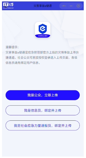 應急管理部發(fā)布“災害事故 e 鍵通”小程序:用戶(hù)可上傳照片視頻采集現場(chǎng)信息