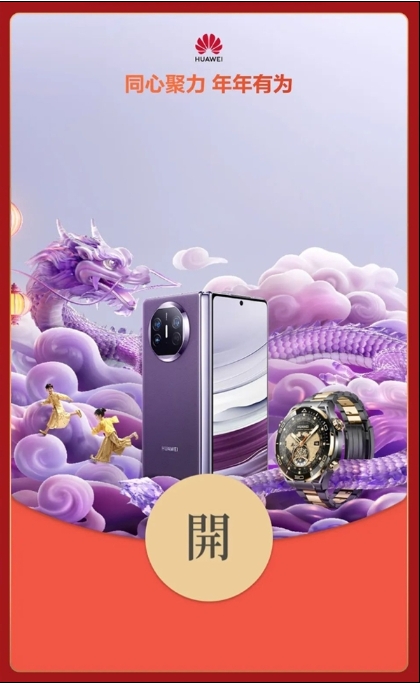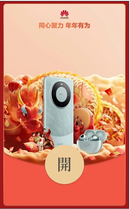 第一個(gè)封面主體是華為Mate 60系列手機和FreeBuds Pro 3耳機,配上金色、紅色龍年元素。