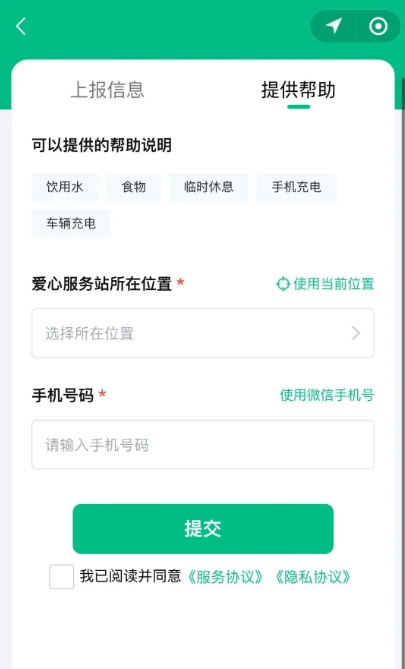如果你家正巧在附近,能提供幫助,可以在小程序里點(diǎn)擊「提供幫助」按鈕,填寫(xiě)可提供的幫助,例如飲用水、食物、臨時(shí)休息、手機充電、車(chē)輛充電等等,為返鄉的游子們提供幫助。