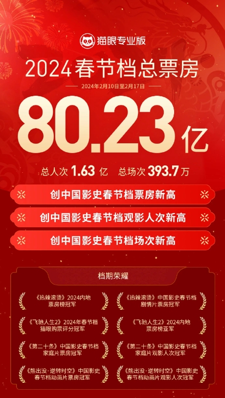 2024 春節檔票房 80.23 億刷新中國影史紀錄,《熱辣滾燙》奪檔期票房冠軍