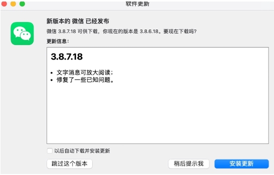 微信 Mac 平臺迎來(lái)了 3.8.7.18 正式版更新,新增了文字消息可放大閱讀功能。