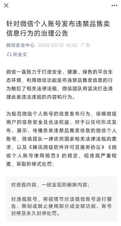 微信安全中心宣布,對于以任何形式發(fā)布、展示、傳播各類(lèi)違禁品售賣(mài)信息的微信個(gè)人賬號,微信團隊一律依照國家相關(guān)法律法規的要求,以及《騰訊微信軟件許可及服務(wù)協(xié)議》《微信個(gè)人賬號使用規范》的規定,視違規嚴重程度,采取階梯式處罰: