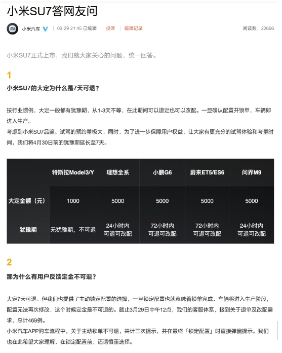 小米汽車(chē)官微發(fā)布“小米 SU7 答網(wǎng)友問(wèn)”,就近日用戶(hù)反饋定金不可退的情況作進(jìn)一步的解釋。