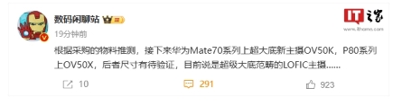 根據采購的物料推測,接下來(lái)華為 Mate 70 系列上超大底新主攝 OV50K,P80(Pura 80)系列上 OV50X,后者尺寸有待驗證,目前說(shuō)是超級大底范疇的 LOFIC 主攝。