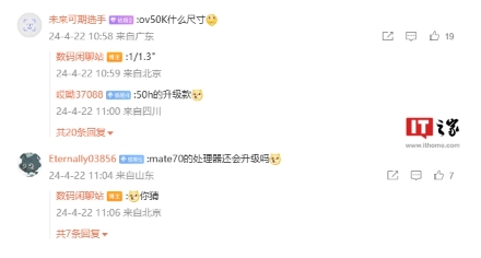 有網(wǎng)友在評論區中詢(xún)問(wèn)“OV50K 什么尺寸?”,博主回復“1/1.3”。此外,還有網(wǎng)友詢(xún)問(wèn)“Mate 70 的處理器還會(huì )升級嗎?”,博主附狗頭表情并表示“你猜”,暗示 Mate 70 系列手機將在處理器部分進(jìn)行升級。