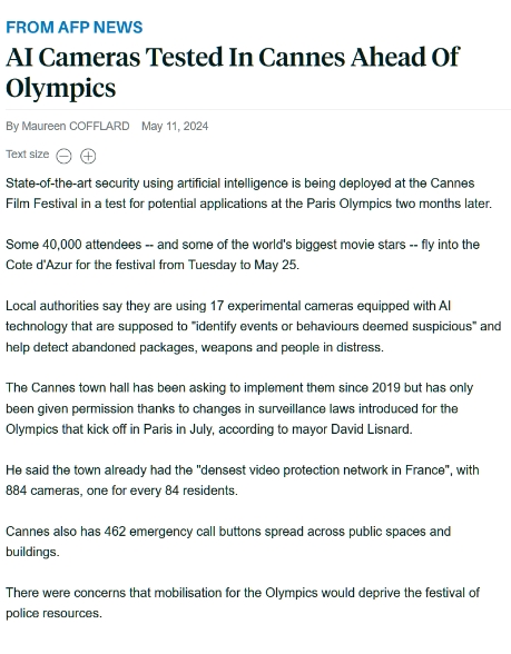 為巴黎奧運安?!颁伮贰?,戛納電影節將部署可識別可疑行為的 AI 攝像頭 09:13:51