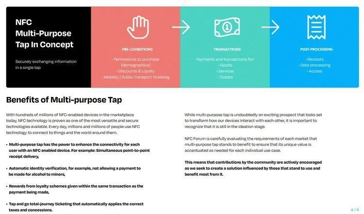 IT之家 7 月 2 日消息,近場(chǎng)通信(NFC)技術(shù)即將引入全新的“Multi-Purpose Tap”功能,讓用戶(hù)使用智能手機、智能手表 NFC 功能時(shí),可以同時(shí)完成多項功能。