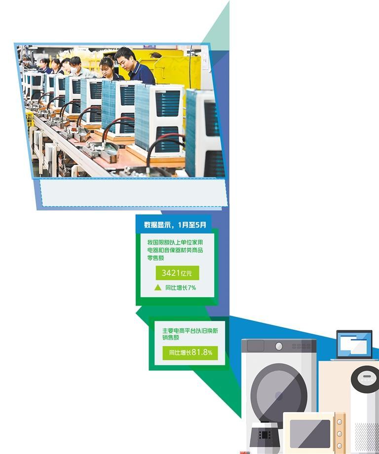 數據顯示,1月至5月,我國限額以上單位家用電器和音像器材類(lèi)商品零售額3421億元,同比增長(cháng)7%;主要電商平臺以舊換新銷(xiāo)售額同比增長(cháng)81.8%。
