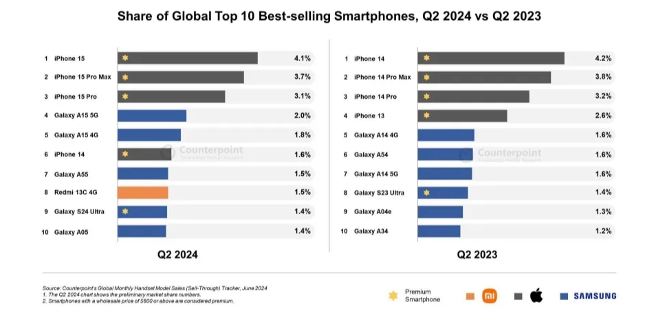 蘋(píng)果、三星 2024Q2 繼續稱(chēng)霸,小米重回十大智能手機榜單