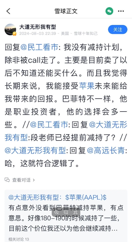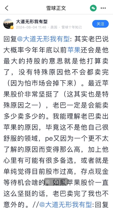 對此,段永平(雪球網(wǎng)名大道無(wú)形我有型)近日回復網(wǎng)友提問(wèn)“是否已經(jīng)提前減持蘋(píng)果”時(shí)表示,“我沒(méi)有減持計劃,除非被call走了。主要是目前賣(mài)了以后不知道還能買(mǎi)什么。而且我覺(jué)得長(cháng)期來(lái)說(shuō),我能接受蘋(píng)果未來(lái)能給我帶來(lái)的回報。巴菲特不一樣,他是職業(yè)投資者,他的選擇會(huì )多一些。”
