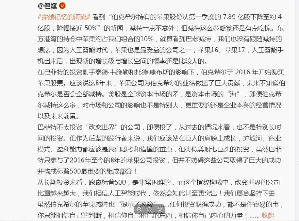 與此同時(shí),東方港灣董事長(cháng)但斌8月4日在微博發(fā)文稱(chēng),看到“伯克希爾持有的蘋(píng)果股份從第一季度的7.89億股下降至約4億股,降幅接近50%”的新聞,減持一點(diǎn)不意外,但減持這么多感覺(jué)還是有點(diǎn)吃驚。