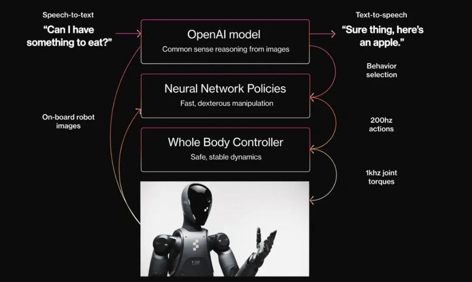 Figure此前有一個(gè)驚艷時(shí)刻——當你和機器人說(shuō),“給我點(diǎn)吃的”,機器人會(huì )把桌子前蘋(píng)果拿給你。這意味著(zhù),機器人不僅能聽(tīng)懂你說(shuō)的話(huà), 還能識別到眼前桌子上有蘋(píng)果,更了解這些蘋(píng)果還能吃、能解人類(lèi)的饞。